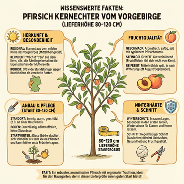 Der Pfirsich Kernechter vom Vorgebirge wurde 1870 zufällig in Ellerstadt entdeckt. Die Sorte ist selbstfruchtbar und kann aus den Steinen vermehrt werden, weshalb er den Namen ‚Kernechter‘ erhielt. Ob frisch vom Baum, als Dessert, zum Einmachen oder für die Herstellung von Saft und Kuchen, die Pfirsiche sind vielfältig in der Verwendung. Sehr robust, mit hohen Ernteerträgen ist der Vorgebirgspfirsich eine Bereicherung für jeden sonnigen Garten.