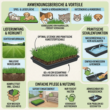 Nicht jeder hat einen eigenen Garten oder die Möglichkeit mit dem geliebten Vierbeiner mal eben in den Park, um die Ecke zu gehen. Dafür gibt es nun dieses kleine Fleckchen grün für die eigene Wohnung, oder den Balkon. Dieser Naturrasen eignet sich zum Knabbern bei Verdauungsproblemen, beugt Haarknäulen vor, dient als Liege- und Schlafplatz. Der Rasen ist bereits fertig angewachsen in einer Schale und muss lediglich einmal in der Woche etwas gegossen werden, je nach Sonneneinfall. Die praktische Plastikschale verhindert ein Auslaufen von Wasser und kann bei Bedarf einfach gereinigt werden. Direkt am Fenster in der Sonne wächst er am besten und bietet ihrem Vierbeiner so ein Stück Natur in der eigenen Wohnung.