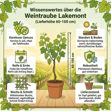 Die Weinrebe ‘Lakemont’ (Vitis) ist eine beliebte helle Tafeltraube, die besonders durch ihren süßen Geschmack und die kernlosen bis kernarmen Früchte überzeugt. Dank ihrer pilzresistenten / widerstandsfähigen Eigenschaften ist sie eine sehr gute Wahl für den Hausgarten und eignet sich auch für Gartenfreunde, die eine pflegeleichte Rebe suchen.